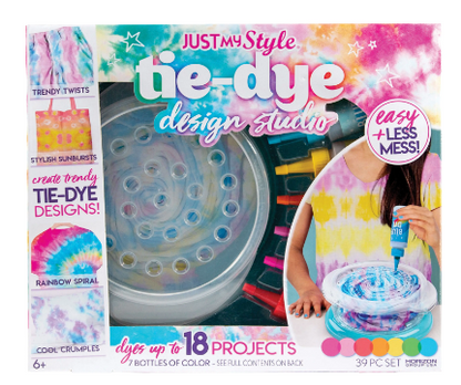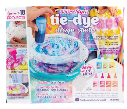 Includes 1 tie-dye studio tool, 7 tie-dye bottles, 5 pairs of gloves,25 rubber bands, and easy to follow instructions
