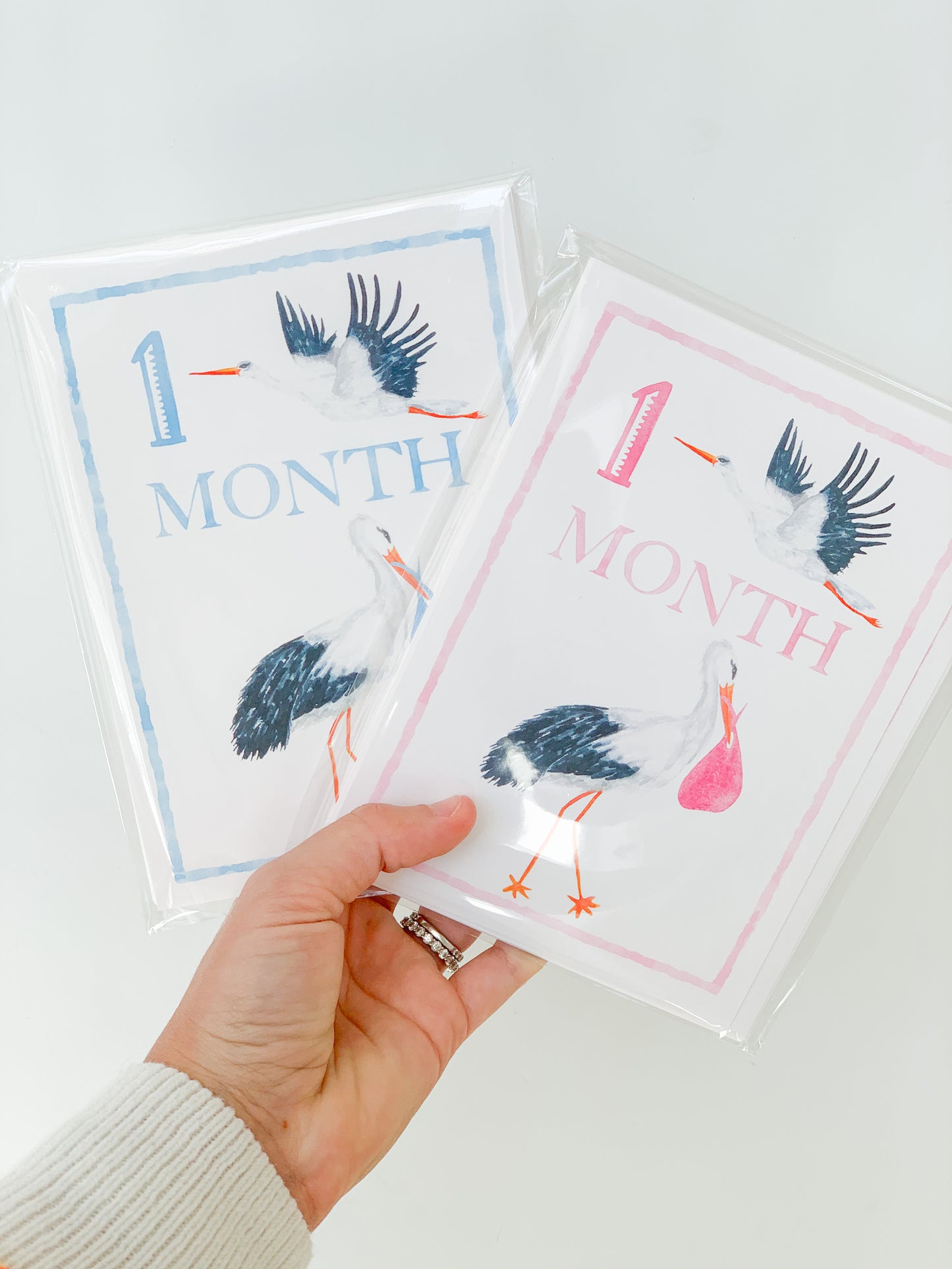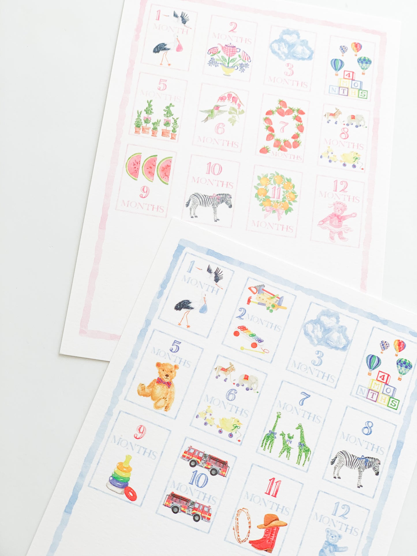 12 Months of monthly milestone cards for cute photos of your baby! They have a watercolor rimmed back so you can write down notes or attach a photo as a keepsake. Choose from a boys set, girls set, a neutral whimsical balloon animal set, and a classic neutral matching lilly of the valley wreath set. We can also make matching stationery and invitations with our illustrations.