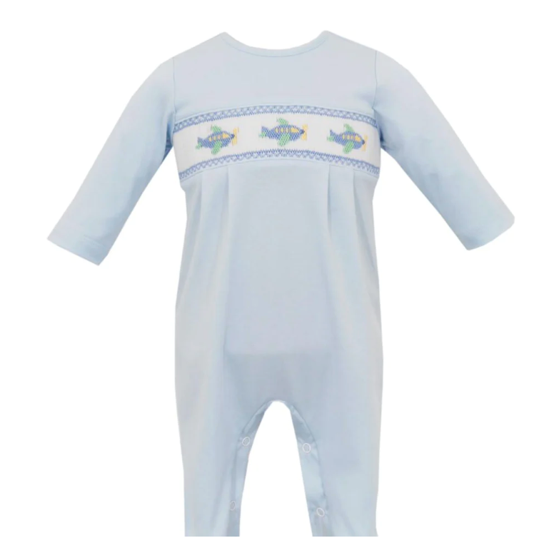 Blue solid knit knit long footie featuring airplane smocking. Adorable!