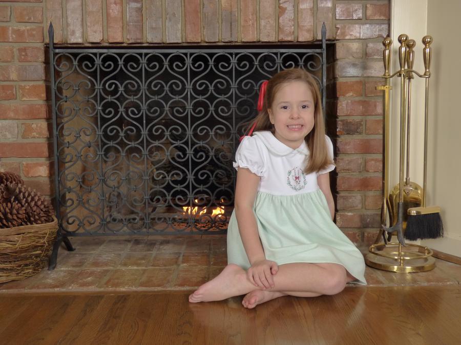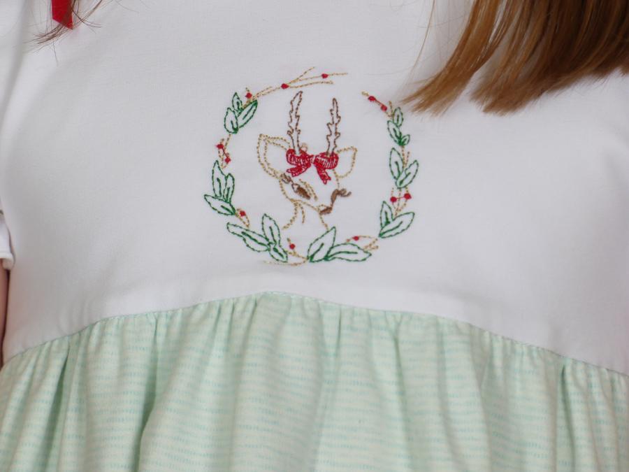 The Canterbury Christmas Collection delivers classic Christmas style in the most comfortable pima cotton knits. Hand embroidered doe wreath/laurel design adorns the front yoke in this two tone dress of white and green/white knit. Features peter pan collar, elastic gathered sleeves and piping accents.