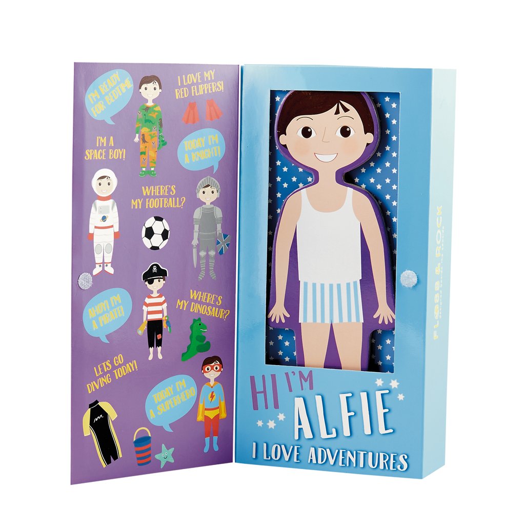 Alfie loves action adventures and can be dressed up in 7 outfits including an astronaut, scuba diver, pirate and footballer. He also has many accessories for each outfit including bucket, shield, football and a parrot! All the pieces are made of wood and are magnetic. Also supplied in the fabulous display box is a fold out background with a bedroom scene on one side and outdoors on the reverse.