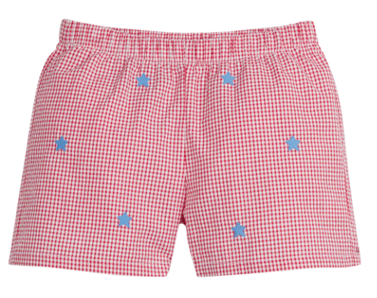 Featuring a red seersucker gingham base and adorable blue embroidered stars, these shorts were made for 4th of July! Easily coordinate with baby brother in the Reversible Button Tab Sunsuit - Stars.