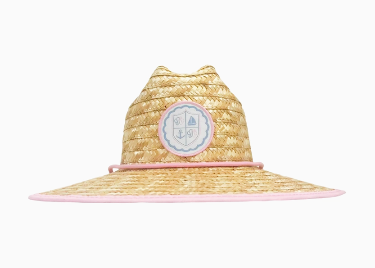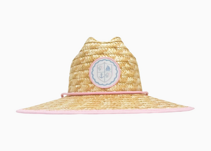 It was only a matter of time before the Lifeguard Hat got the playfully polished Bits & Bows twist! From days at the beach to boating on the bay or lake, this hat features a flattering, sun-protecting shape, breathable straw construction, adjustable chin strap, and a decorative patch inscribed with a coastal anchor, sailboat, and logo crest. • Features a cattleman's crown, wide down-sloped brim, and adjustable blue toggle chin cord & cord-stopper • Blue and white striped fabric on bottom of brim, solid blue trim • Woven of wheat straw in the perfect sandy shade • Fits on average children ages 3-8 years old (54cm circumference)