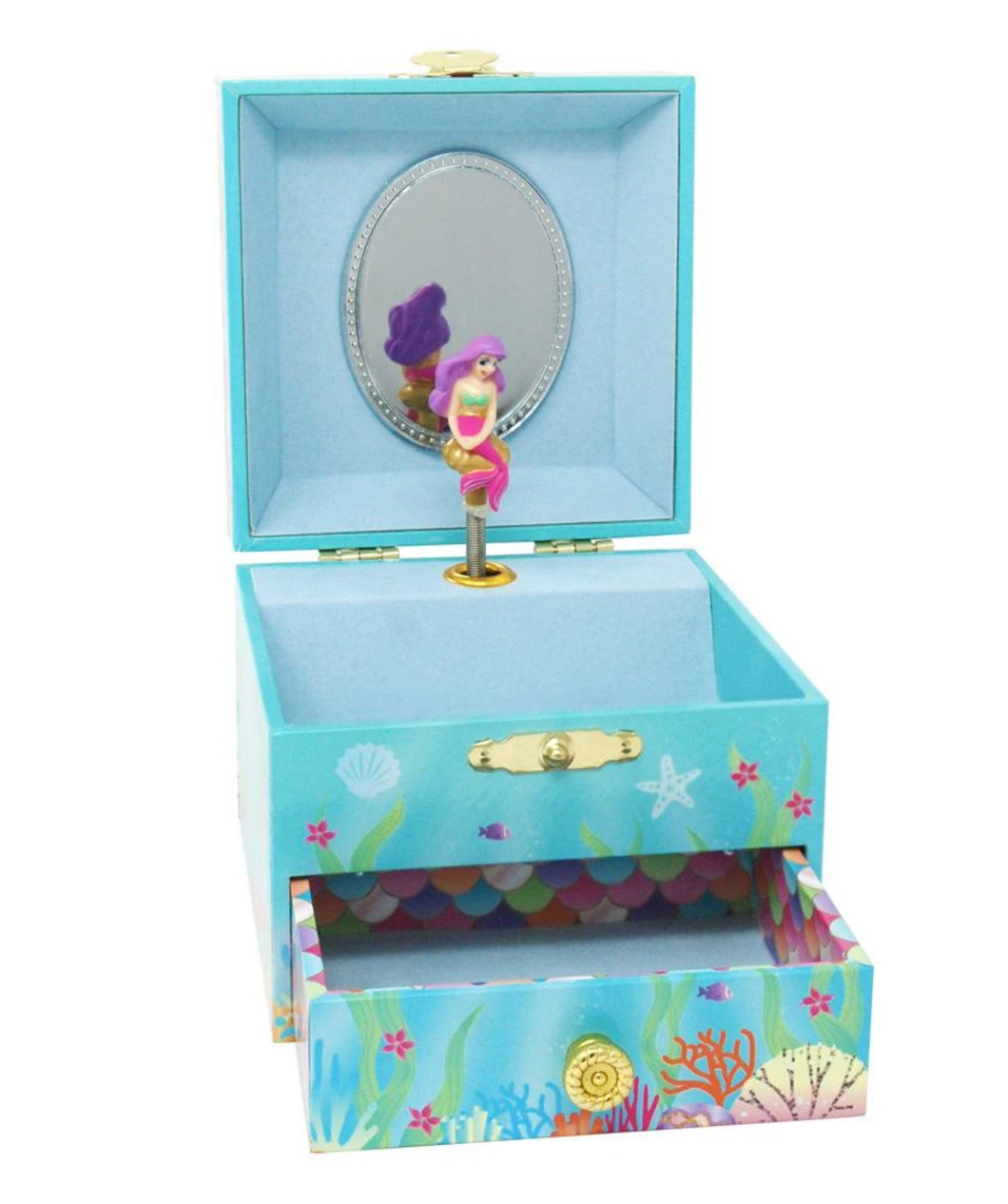 This Mermaid themed musical jewelry box is a gorgeous keepsake for little ones covered in rainbow scales and illustrations of an underwater oasis. The wind up design plays the classic tune 'Waltz of the flowers' whilst the mermaid figurine twirls delightfully. It features an oval mirror and flocked interior.