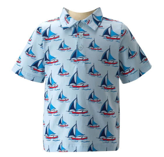 New! This boys jersey polo shirt boasts a playful sailboat print on a classic blue background. Perfect for summer, its nautical style makes it a versatile piece for both casual and formal occasions. Easily pair with trousers or shorts for a stylish and comfortable look.