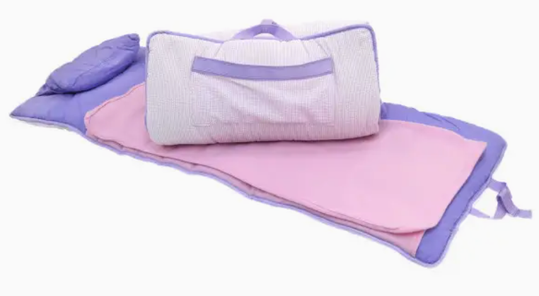 Easy to monogram on the outside pocket, the pillow, or anywhere on the blanket. Padded and lined with nylon and cotton with a ribbon-trimmed, soft, fleecy blanket. Easily rolls up and can be carried by the toddling toddlers on their way to Mother's Day Out, preschool, or to the corner for a time out. Be sure to see our seersucker nap rolls, too!