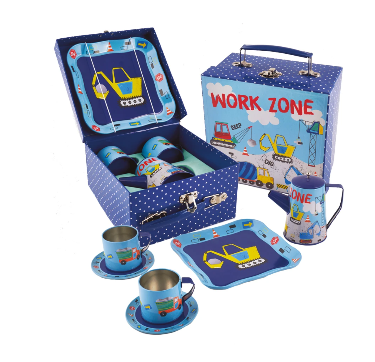 Built for the building site our "Construction" themed 7 piece tin Tea Set has 2 mugs with saucers and lidded coffee/tea jig and a serving tray and comes in a cardboard reusable attache style carry case.